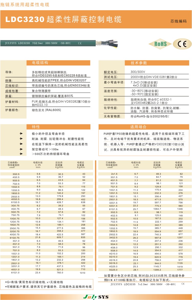 拖链系统用超柔性屏蔽控制电缆 LDC3230系列