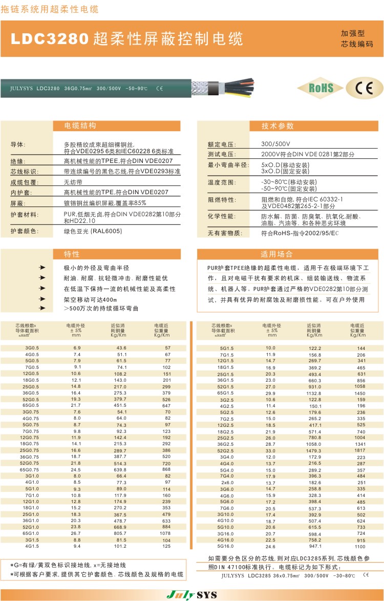 拖链系统用超柔性屏蔽控制电缆(加强型) LDC3280系列