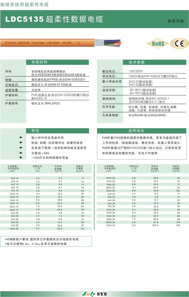 输送线、物流系统、机器人等而设计。PUR护套通过严格的VDE0282第10部分测试,并