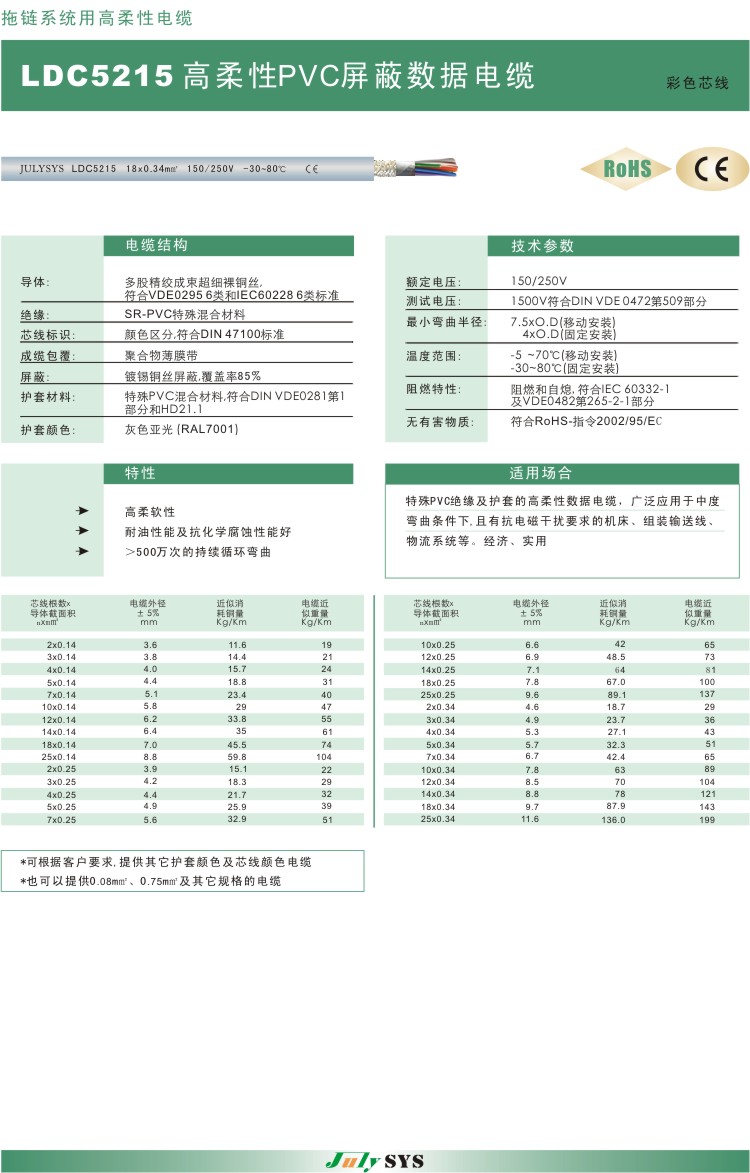 拖链系统用高柔性PVC数据电缆  LDC5215系列